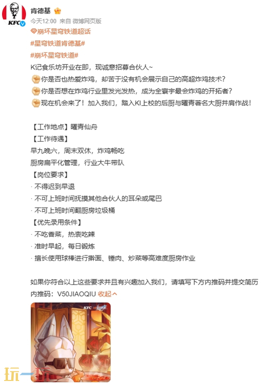 崩坏星穹铁道2025年1月17日再次与肯德基联动,推出全新K记食乐坊。此次联动的角色为崩坏星穹铁道中的仙舟曜青神秘角色。K记食乐坊即将开业,现诚招合伙人,邀你一起开创精彩未来。
